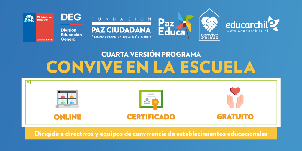 El programa, liderado por Fundación Paz Ciudadana y el Ministerio de Educación, con colaboración de EducarChile, tiene como objetivo general fortalecer las competencias técnicas asociadas a la gestión de la convivencia escolar en equipos directivos y de convivencia escolar de establecimientos educacionales con financiamiento del Estado.