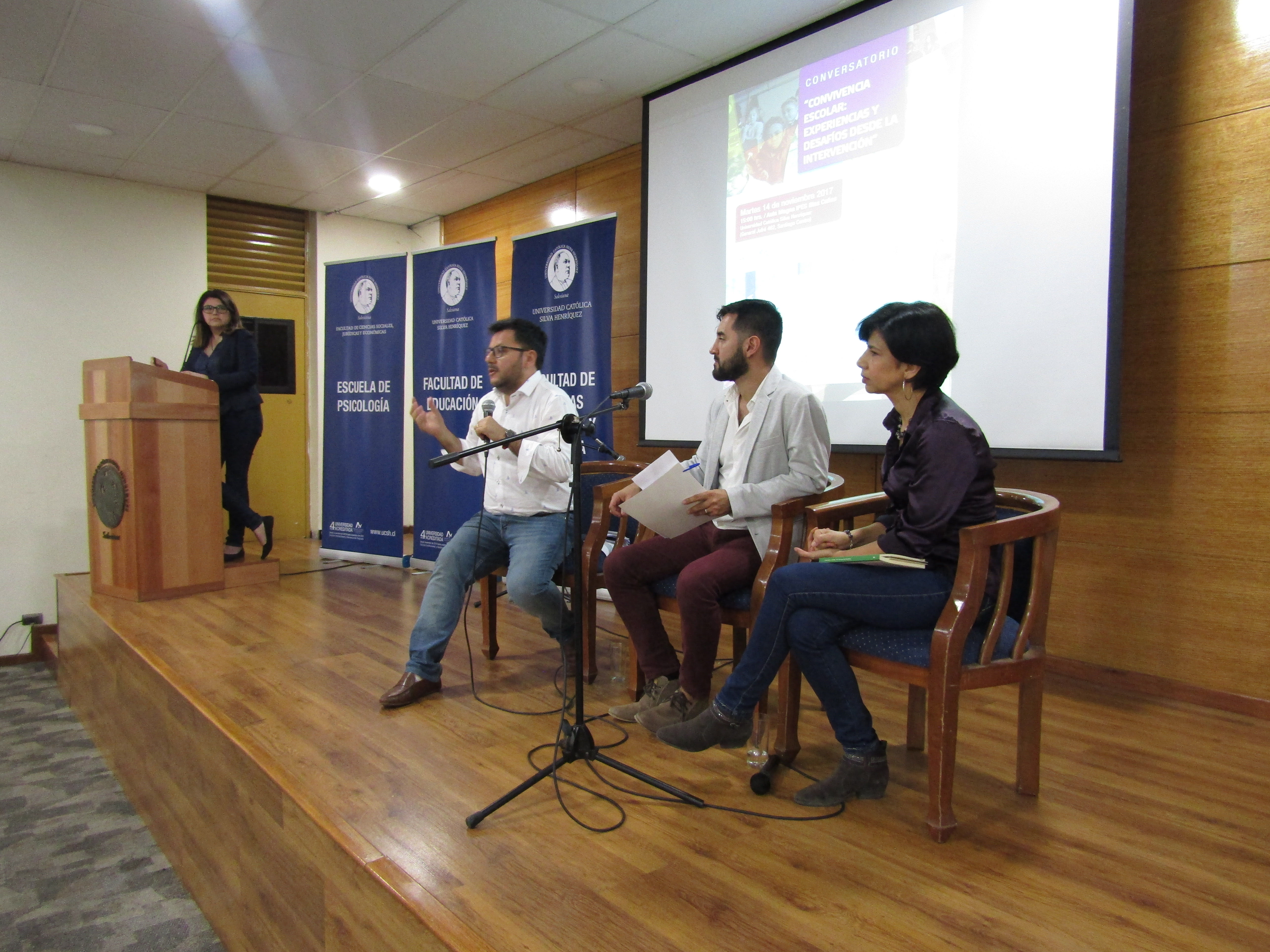 Los panelistas —Tatiana Soto, psicóloga y académica de esta casa de estudios; Rodrigo Bassaletti, psicólogo e investigador de Fundación Paz Ciudadana; y, Jaime Retamal, académico e investigador de la Universidad de Santiago (USACH) — expusieron temas relacionados con el ámbito, con experiencias concretas de cómo y qué está pasando hoy al interior de las aulas, así como las vías de acción para mejorar la convivencia escolar.
